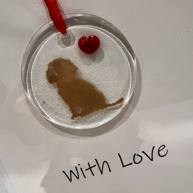 A cute fused-glass brown dog, full of character, on a With Love card. Left blank inside for whatever message you want to send.