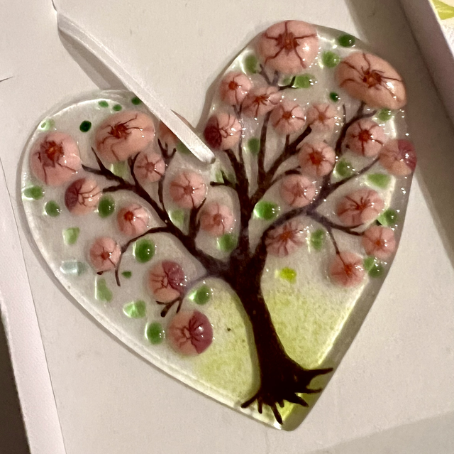 Inspired by the delicate beauty of the Japanese cherry blossom tree, this fused glass hanging heart captures a sense of calm, renewal and quiet joy. Soft pink blossoms sit on fine branching details, set against gently textured glass with fresh green accents that add depth and light.