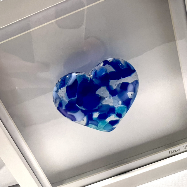 This framed fused glass heart is a one-off piece made earlier in my glass journey. Simple and timeless in design, the layered blues create depth and movement within the heart, catching the light beautifully.