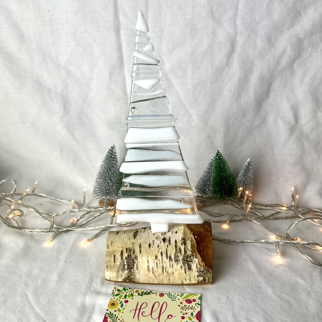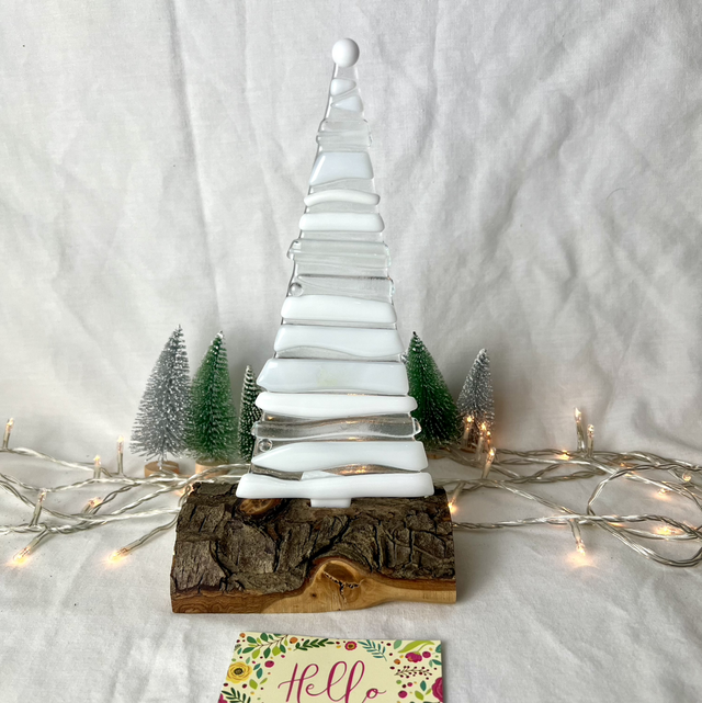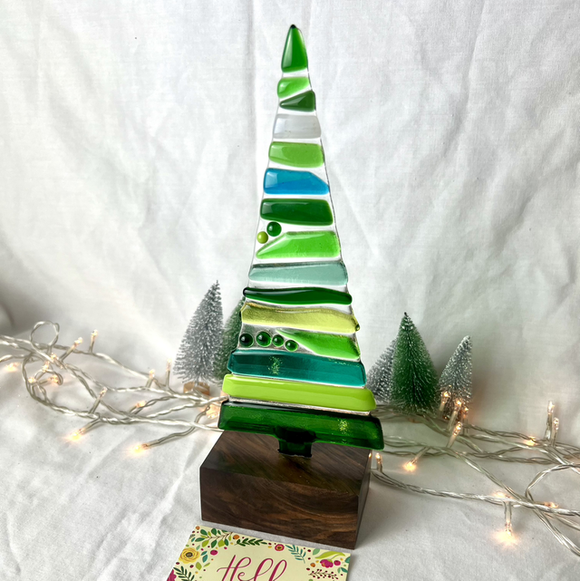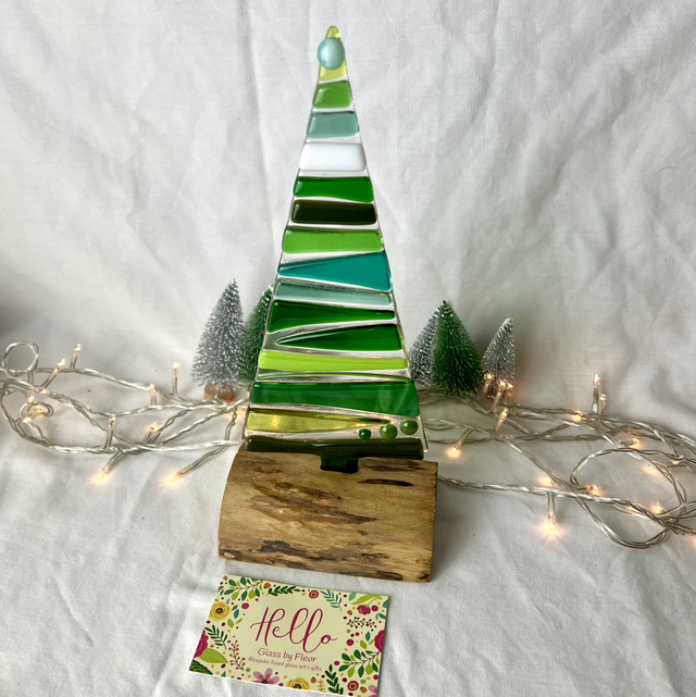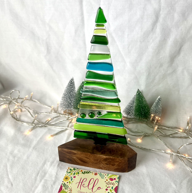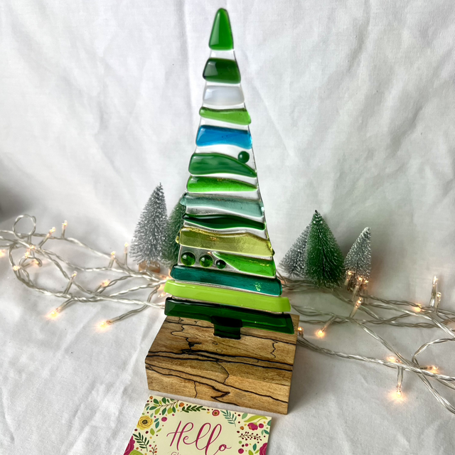 Each tree is handmade in my studio, with layers of cut glass fused together to create beautiful depth and movement. Every piece is completely unique — both the glass tree and the solid wooden base vary naturally from piece to piece.