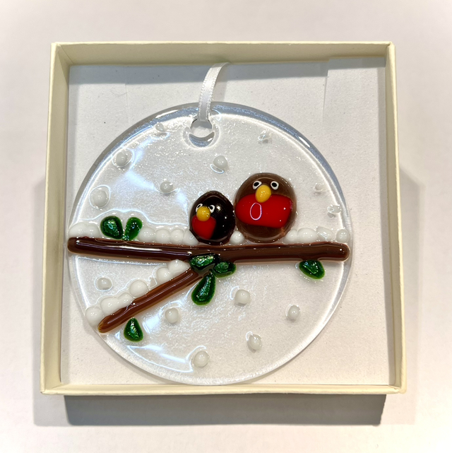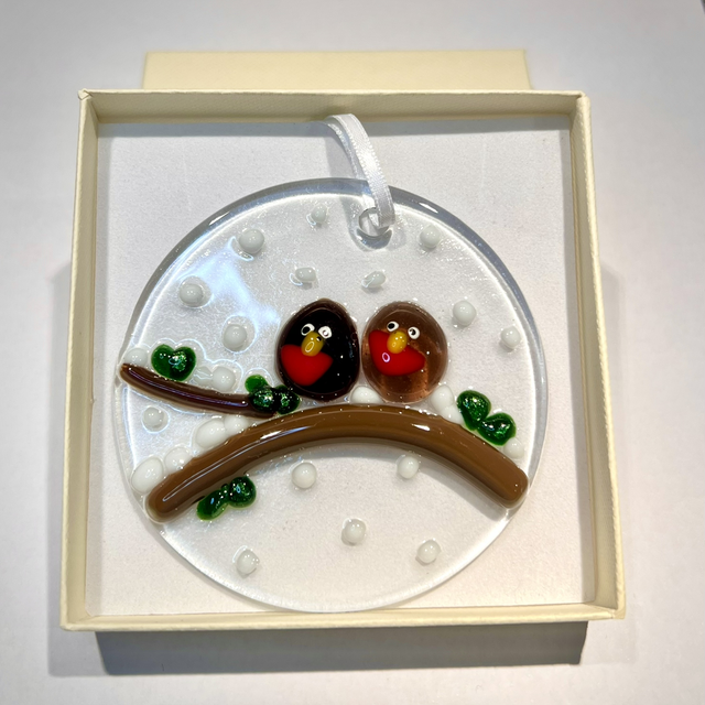 Bring a touch of winter wonder to your home with this charming fused glass bauble. Featuring two sweet little robins perched on a snowy branch, it captures the magic of a crisp, wintry day. Handcrafted with care, each bauble is a unique and slightly different, perfect for adding warmth and charm to your Christmas decor or gifting to someone special.