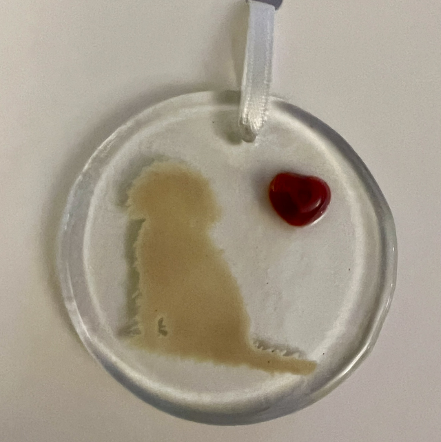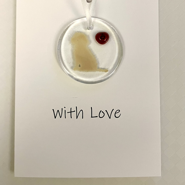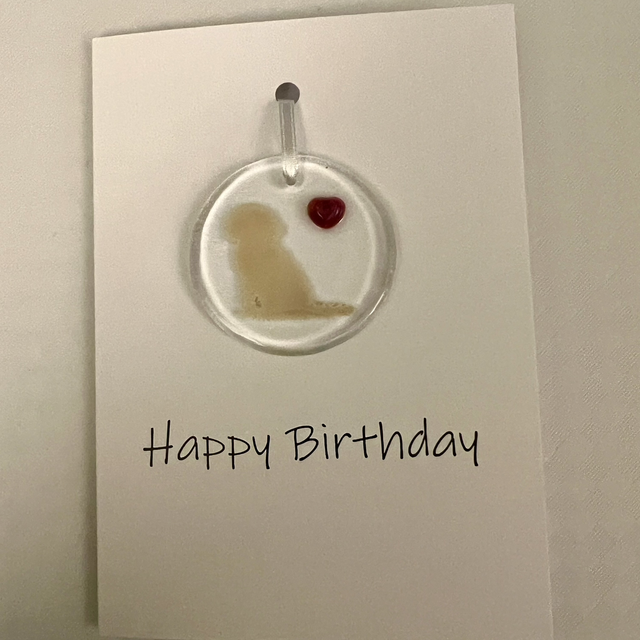 A sweet golden shaggy dog crafted in fused glass. Blank inside for whatever message you’d like to send.