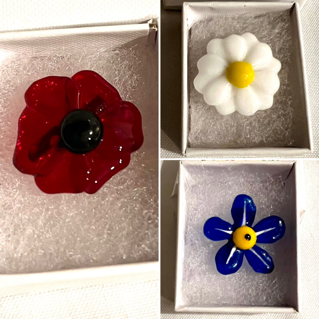 Bright, joyful and full of personality, these handmade fused glass brooches are inspired by much-loved flowers — poppies, forget-me-nots and daisies.