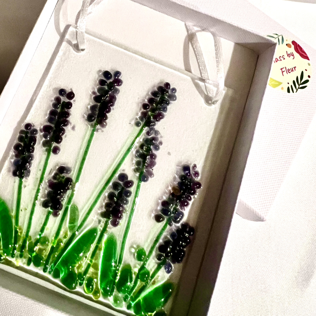 A beautifully calming fused glass picture hanging inspired by lavender in bloom. Slender green stems rise from a textured base, topped with delicate purple glass details that catch the light softly and create a sense of movement and depth.