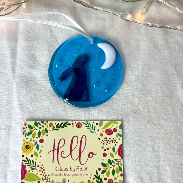 The delicate hare silhouette appears to pause beneath a crescent moon, with gentle texture and subtle details created during the fusing process. Finished with a white satin ribbon, they look beautiful hanging in a window, on a wall hook, or as a seasonal decoration that can be enjoyed all year round.