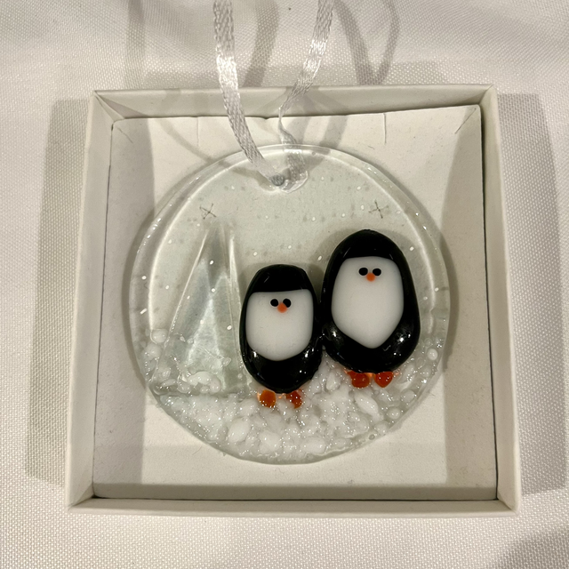 An irresistible little pair of penguins cuddled together in this handmade fused glass hanging. With their snowy base, soft winter tones and tiny orange feet, this piece is full of charm and personality.