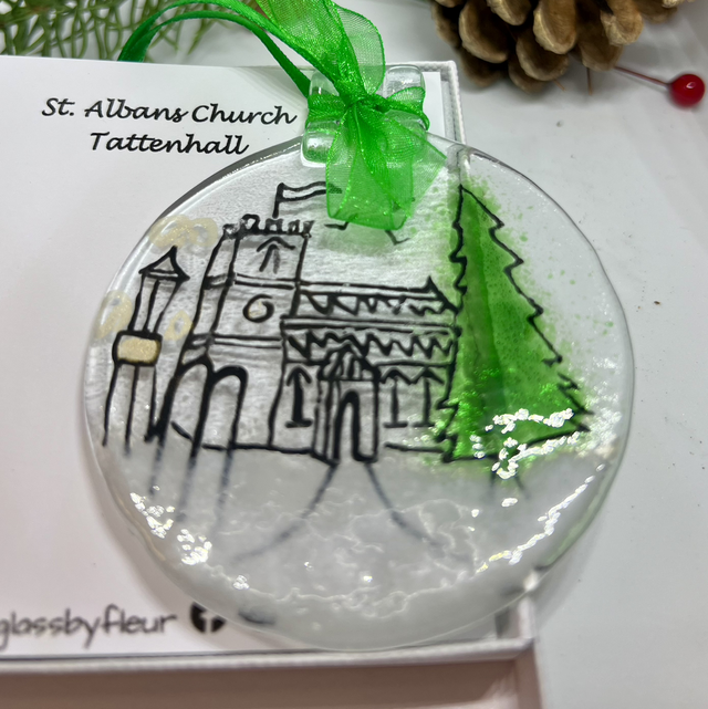 This unique handcrafted fused glass bauble is a special tribute to the charming village of Tattenhall. Featuring the iconic village church adorned with a festive Christmas theme, it captures the essence of this beautiful Cheshire village. A perfect gift for current or former residents, this bauble brings a touch of local pride and holiday cheer to any home. A beautiful keepsake to treasure for years to come.