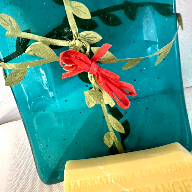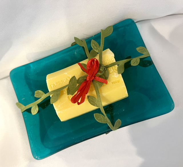 This handmade fused glass dish features rich teal glass with soft movement and tiny air bubbles suspended throughout, giving the surface depth and a lovely glassy glow. It’s a calm, elegant colour — not overtly festive, but it styles beautifully for winter and Christmas gifting, especially when paired with the artisan soap.